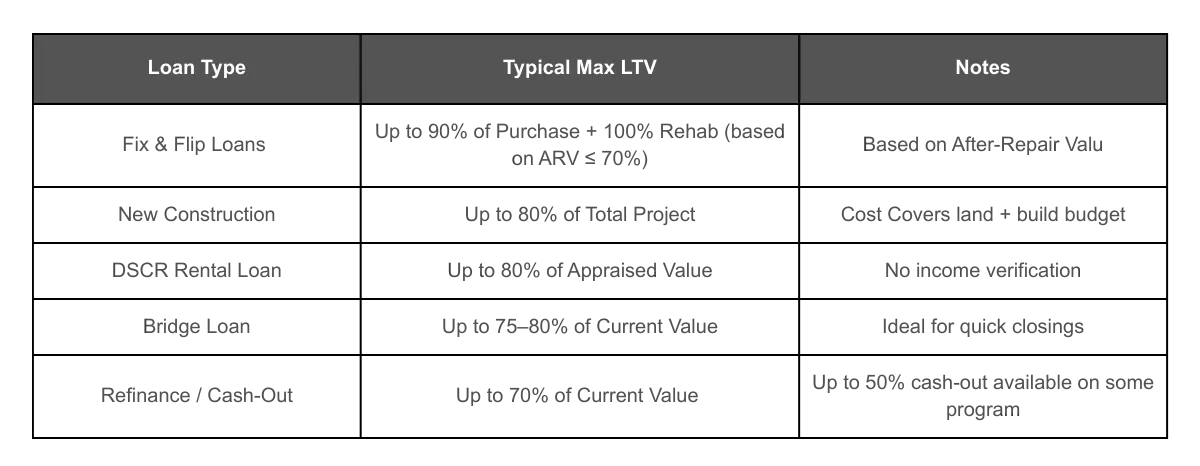 Different loan programs have different LTV limits based on the type of project, risk, and experience level.